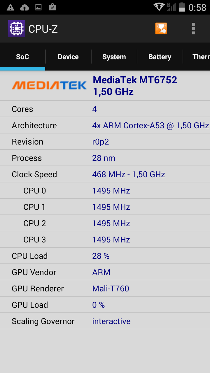 - Процессор: Quad Core , 1.5 ГГц. MediaTek MT6732. Видеоподсистема: GPU Mali-T760 (вообще писать "процессор" несколько некорректно, т.к. во всех современных смартфонах используется SoC - однокристальная система, т.е. чип, который выполняет как функции CPU, так и GPU).