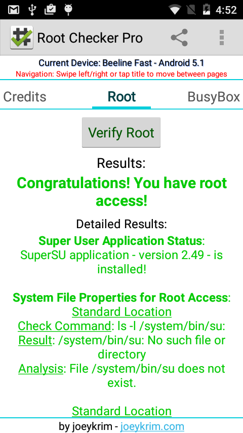 Внимание! Перед установкой root обязательно сделайте Backup своей "нерутированной" прошивки в TWRP. После установки Root первый запуск телефона продлится около 5 минут, т.к. Android начнет оптимизировать ~105 приложений. Результат корректности установки root можно посмотреть в Root Checker: